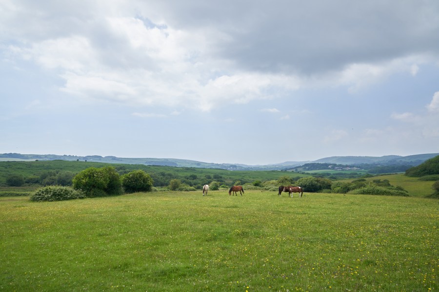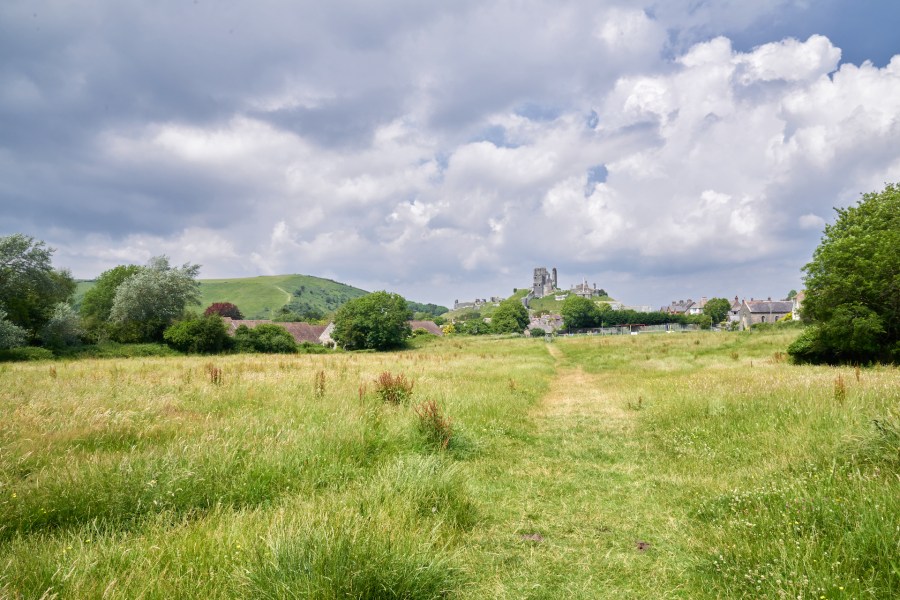 Middle Halves is a long, vaguely rectangular common leading from near the church to the edge of Corfe. At the top, it’s very municipal and its lush mown grass sports a playground, basketball hoop, picnic tables and a toilet. After that, it’s mainly meadow, the cottages backing onto it each with their own gate, with trees dotted around the edge. In the centre is a fenced off area surrounded by trees which splits the meadow in two, and in which something or other is allowed to graze from time to time, though it wasn’t there when I visited, whatever it is. There’s also a small, wooded enclosure, not access land so presumably not common. There are plenty of benches and, especially with the long, swaying grass, there’s a real feeling of leisure. Originally, the Halves were used for strip farming for subsistence crops, like allotments are today. I was glad to be pointed in the right direction for the main common by a couple of residents, and pleased to see a long chat being had with a postie, as it was all too easy to see the place as a tourist trap; the almost oppressively photogenic castle looms over all these commons.