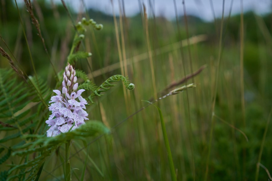 Corfe Common is in two parcels and I didn’t have time to visit both. Both have active commoners. Together, they make up the largest expanse of common in Dorset, according to the National Trust who seem to own or manage the one I didn’t visit, given the characteristic metal signage I found at one of its entrances. The one I did visit is both managed by hand and grazed as heathland, an expanse of undulating land crossed by lanes, a busy B-road which looks across Corfe to the castle. A stream idles through a slight combe, gathering around it the signs of dampness: willows and rushes and duckboard crossings. When I visited, the common was filling up with lime-green bracken and its paths were dotted with lesser heath orchids from deepest to palest pink. It’s also fenced in due to the grazing. There are eight round barrows on its highest ridge, possibly indicating settlement going back 8,000 years.