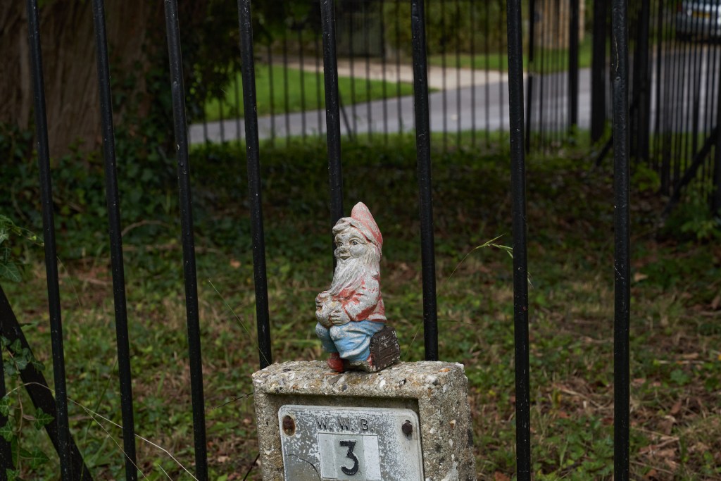 Opposite the pump is a little triangular green with a slightly sinister conifer, which is surrounded by railings with a gate into them (and guarded by a fire hydrant crowned with a small plastic gnome). The railings make no sense (as if the gnome has been placed as commentary on this) because you can’t stand up and be within them. I suspected, and have now been confirmed by DEFRA’s data, that this is The Coronation Tree (or at least the site of it) and which is, so it seems on the parish website, a bit of a point of contention when it comes to health and safety and Christmas lights. I’m wondering if maybe it was common land before the coronation, whichever one that was, and this is suggested by its classic triangular green shape.
