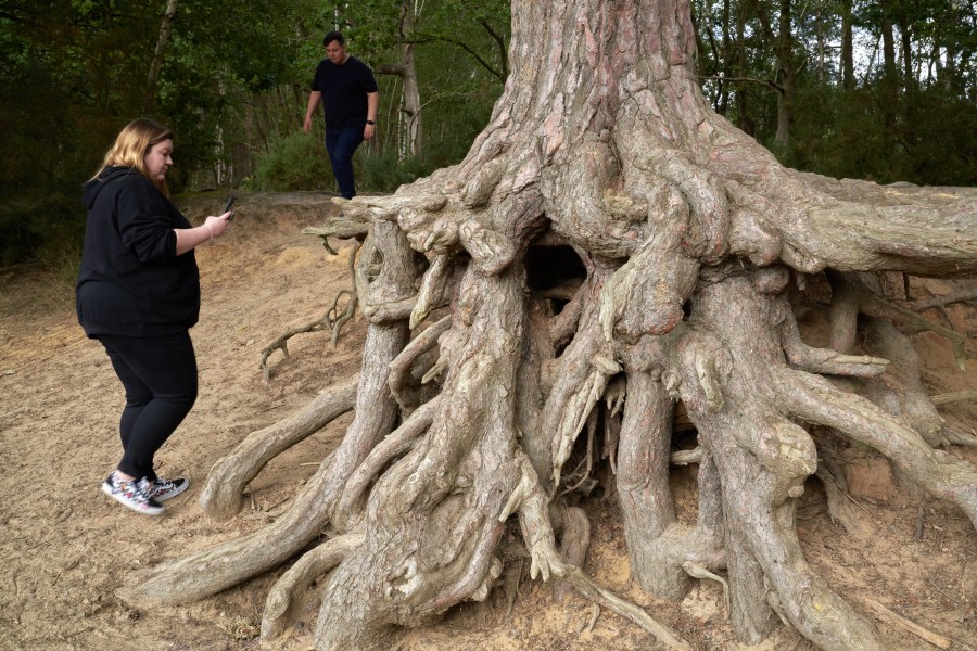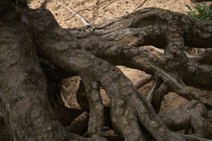 Sand being highly unstable, the pines at its rim don’t have an enviable future. Presumably once a considerable distance from the ever-eroding perimeter, these trees have their roots exposed which presumably will one day be insufficient to stay upright. These exposed roots look strangely tentacular, not just in the shapes grasping at the ground, but also in the curious sucker-like textures of their upward surfaces.