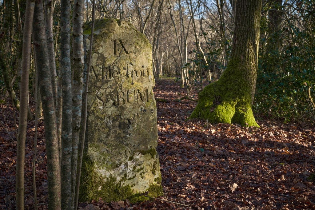 This stubborn refusal of tracks to go where they’re supposed to seems to be nothing new. I came across a c.18th milestone hidden in the woods, about fifty yards from the well-trodden track, which indignantly declared itself to be IX miles from Sarum. The OS map supports its claim: the Public Byway indeed does pass right by it. It’s just that people don’t like following rules and maps are rule-enforcers par excellence.